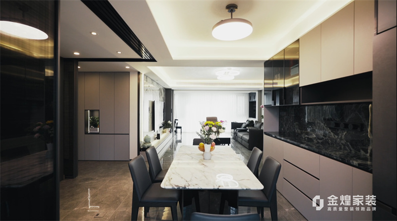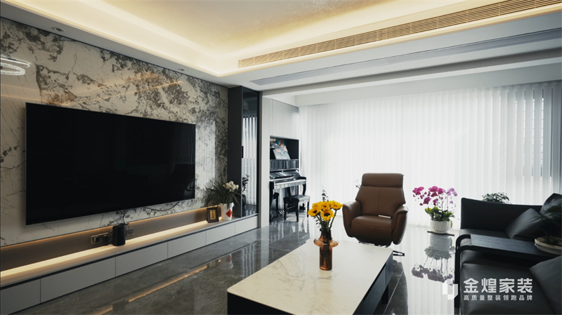 电视背景墙的大理石纹理、简洁的家具线条以及精心布置的灯光设计,都体现了现代轻奢风格的特点。同时,通过添加一些鲜花和装饰品,增加了空间的温馨感和生活气息。