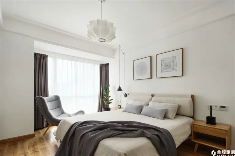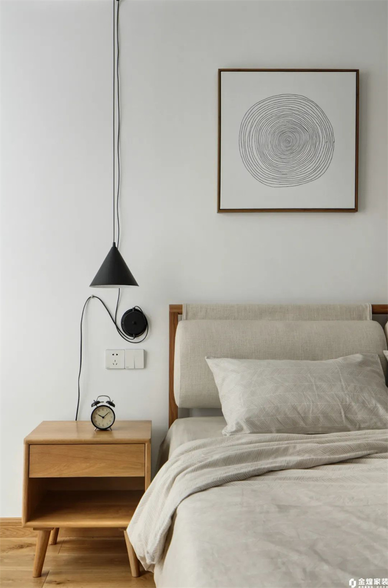 主卧墙面采用浅米色,搭配天然木质的艺术挂画作为床头背景,质朴自然。简约的原木床架与柔软的棉麻床品相互呼应,让整个空间充满舒适感。