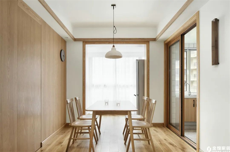 餐厅延续了原木风格的温润与自然,木质餐桌和椅子以简洁的线条设计呈现,展现出一种质朴而不失现代感的美。柔和的灯光洒落在餐桌上,营造出舒适且温暖的用餐氛围。