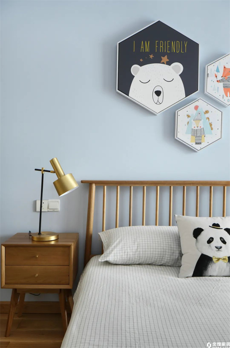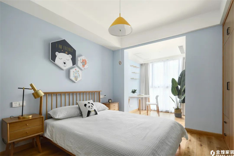 儿童房在原木风格的基调上,加入了更多活泼明快的元素。阳台光线明亮,阳光洒满整个空间,使房间充满了温暖和生机。阳台一侧设置了一张简洁的原木书桌,书桌靠窗,孩子可以在自然光下进行学习和阅读,充分享受清新的室外景色。
