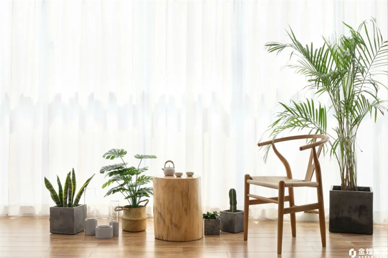 阳台铺设着浅色原木地板,阳光透过玻璃窗洒满整个空间,再点缀几盆绿植,生机勃勃的绿意与原木色调相互映衬,为空间注入了自然的活力。