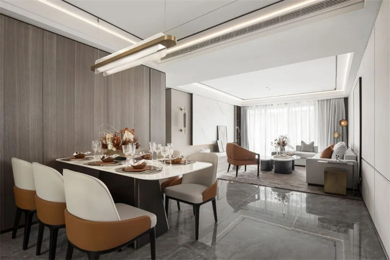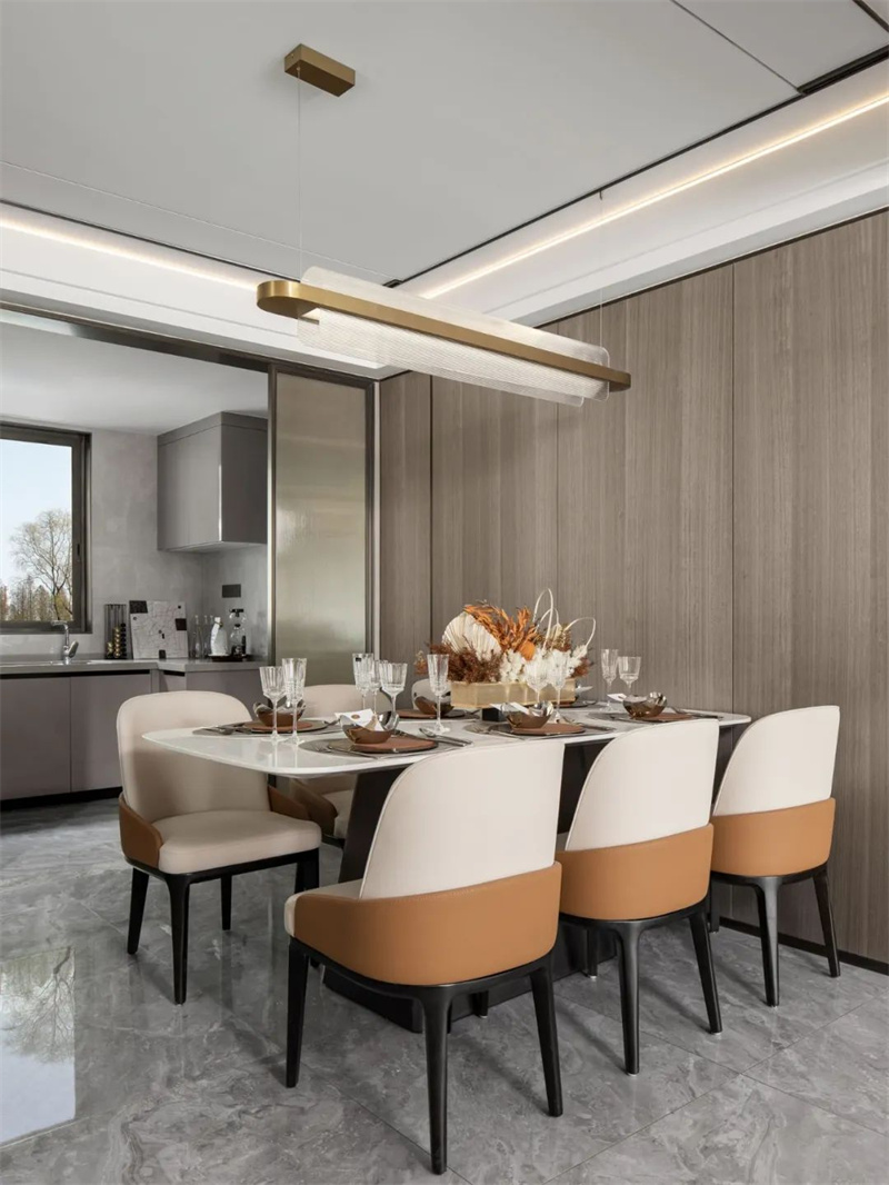 餐厅空间与客厅相连贯,整体宽度充足,居中摆放一套简约岩板餐桌+舒适的皮艺餐椅,让用餐氛围轻松闲适。餐桌上的插花和素雅的餐具恰到好处地点缀着整体设计,既保留了简约的美感,又增添了一抹生机和活力。