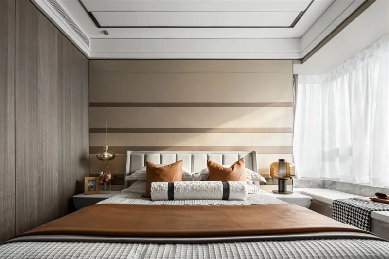 主卧色调以柔和的灰白为主,带来宁静而舒适的氛围。床头靠背采用暖色的软包设计,简洁却极具质感,与木色边柜形成和谐的对比。超大窗户带来卓越的自然采光条件,同时扩大了空间的视觉效果,为房间注入更多的明亮和开阔感。