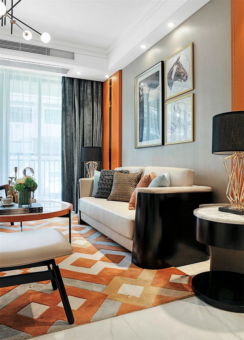 客厅的设计完美诠释了法式轻奢的精髓,一张极具视觉冲击力的爱马仕橙色地毯铺陈于大理石地面上,与浅米色的沙发和金属质感的茶几形成鲜明对比,营造出层次分明的视觉效果。柔和的灯光与古典装饰挂画,为整个空间增添了一份温暖的浪漫氛围。