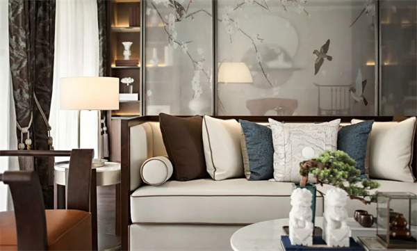 沙发墙在硬包基础上加入诗意背景画面,搭配新中式的沙发,侧边配上坐椅、盆栽绿植的布置,使得整个客厅充满着儒雅端庄的氛围气息。