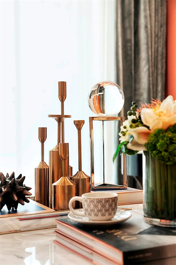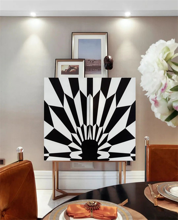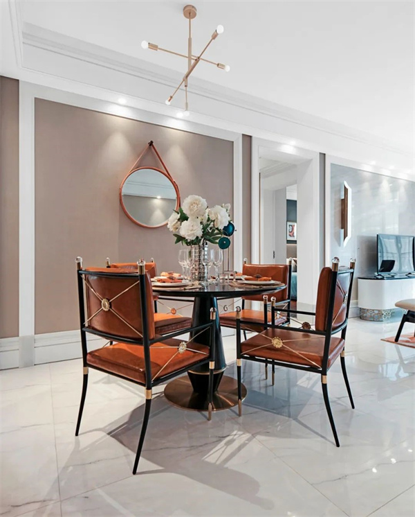 餐厅设计讲究细节与品质的融合。中央的餐桌简洁大气,围绕它摆放着几张极具辨识度的爱马仕橙色餐椅,与同色系的装饰品相互呼应,为餐厅增添了一丝活力和时尚感。餐桌上精致的餐具与花艺装饰,为每一餐的时光都赋予满满的仪式感。