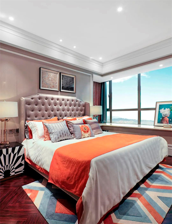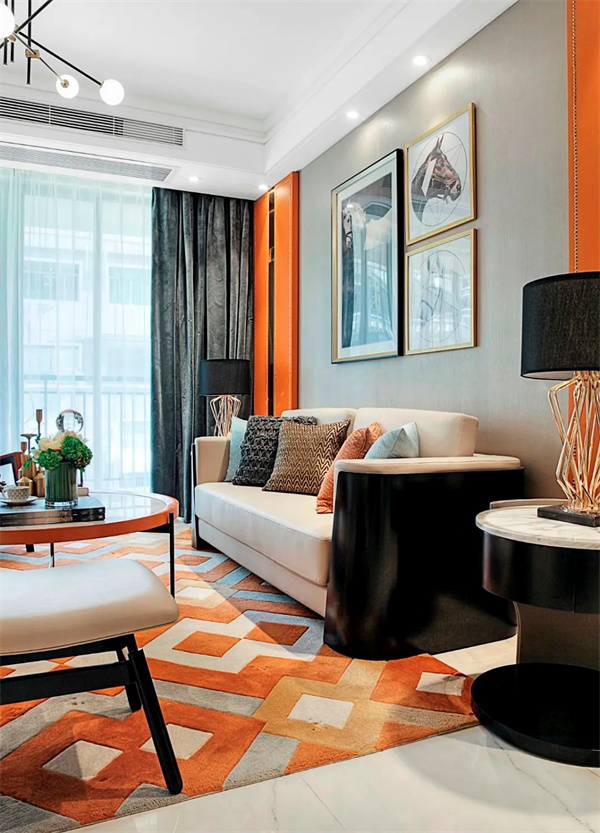 客厅的设计完美诠释了法式轻奢的精髓,一张极具视觉冲击力的爱马仕橙色地毯铺陈于大理石地面上,与浅米色的沙发和金属质感的茶几形成鲜明对比,营造出层次分明的视觉效果。柔和的灯光与古典装饰挂画,为整个空间增添了一份温暖的浪漫氛围。