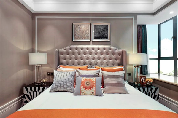主卧中,优雅与奢华交织成了一幅梦幻的画卷。床头采用软包设计,柔软的天鹅绒床品与大飘窗相互呼应,在灯光下散发出温暖的光泽。金属边框的镜子与床头柜上简约的台灯为卧室增添了一丝现代感,同时保持轻奢的调性,使空间既舒适又不失格调。